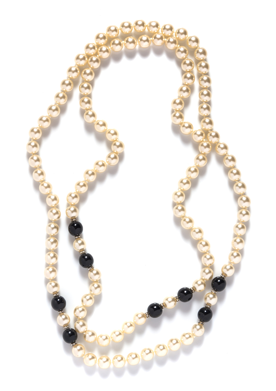 comprised of two matching necklaces each with faux jet beads, together with a faux pearl necklace with faceted faux jet and clear stones. One necklace is stamped: Kenneth Lane.