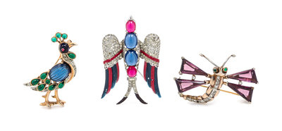 comprised of a goldtone amethyst dragonfly brooch, a silvertone faux ruby, faux sapphire and pave rhinestone bird brooch, and a goldtone faux emerald and faux sapphire peacock brooch. Each stamped: Crown Trifari.