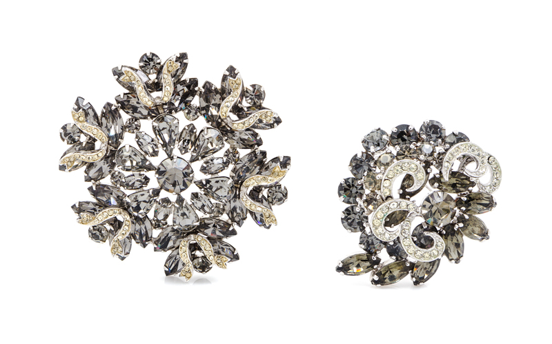 Two Weiss Silvertone Grey Rhinestone Brooches.