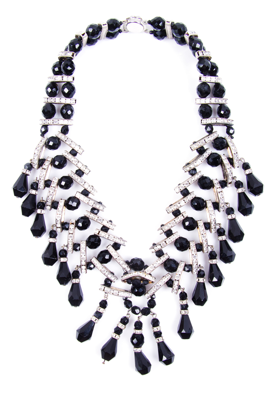 A Vintage Jet Black and Clear Rhinestone Beaded Fringe Necklace.