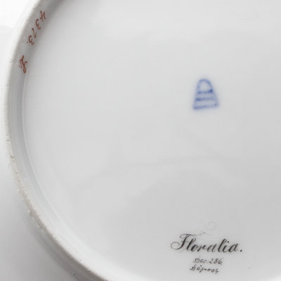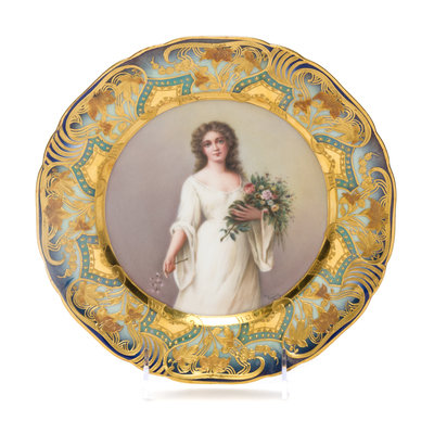 Floralia, centered with a portrait of the goddess holding flowers, signed Wagner, within an Art Nouveau gilt border, the verso titled with shield mark in underglaze blue.