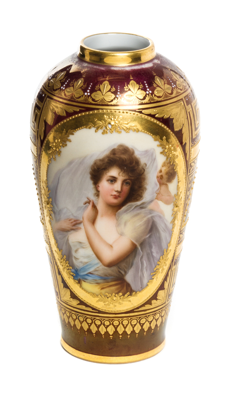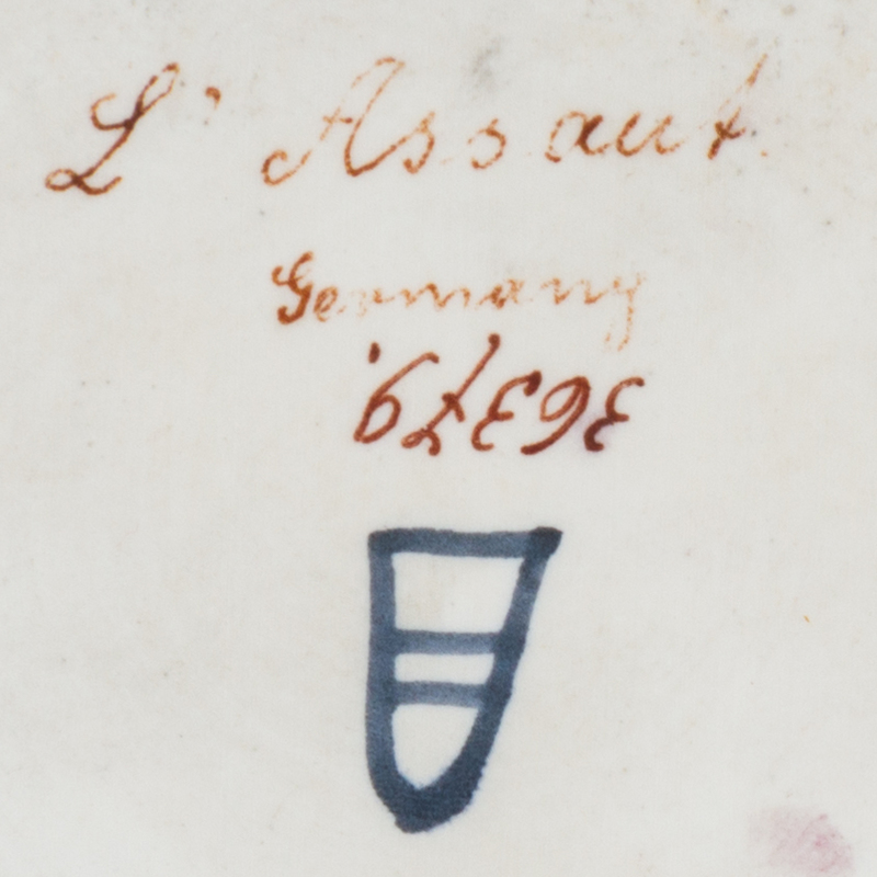 Assaut, of ovoid form, decorated with a maiden and a putto, the base titled with shield mark, Germany and numbered 36379.