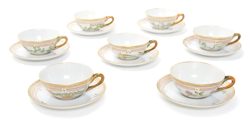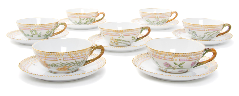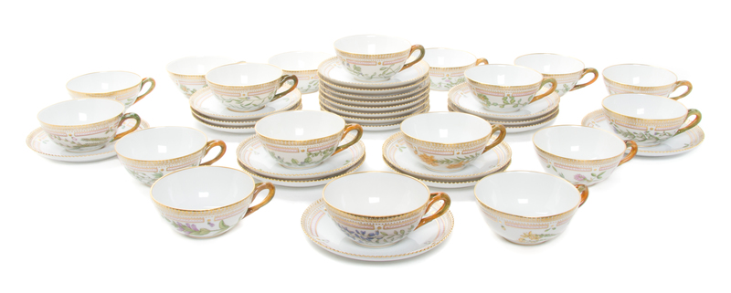 Eighteen Royal Copenhagen Flora Danica Teacups and Saucers