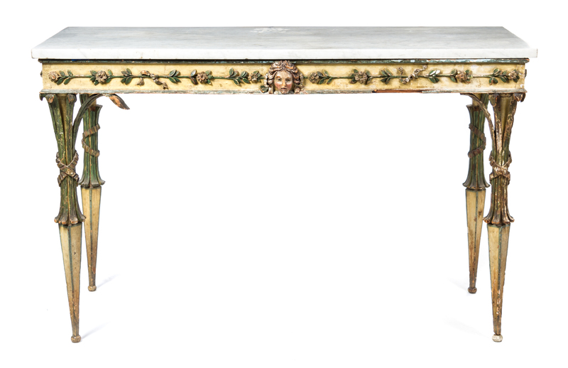 having a rectangular marble top over a foliate and mask carved frieze, raised on square tapering legs headed by openly carved ribbon-tied leaves.