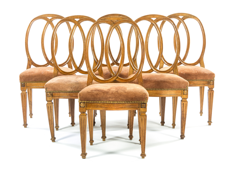 each having a double-loop back over a suede-upholstered stuffover seat with nail heads, raised on fluted square tapering legs.