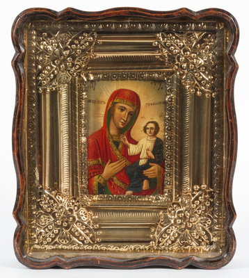 depicting the Madonna and Child, set in gilt metal frame within a shadow box frame.