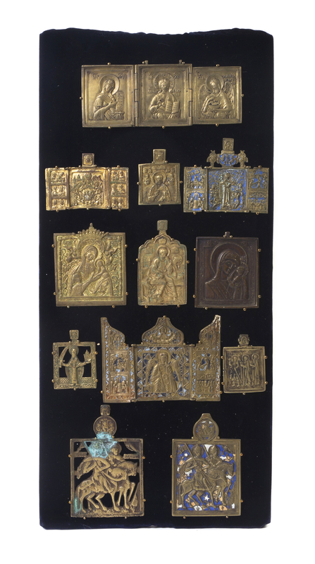 Twelve Russian Polychrome Enameled Bronze Icon Pendants