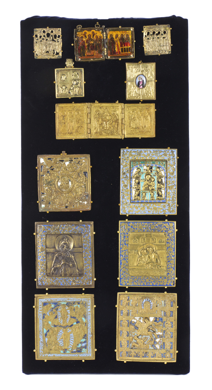 comprising a painted diptych depicting Christ and Apostles beneath a metal riza, a four panel example depicting saints, a four panel porcelain inset example depicting a priest, a triptych depicting Christ and Apostles, Our Lady of the Burning Bush, Our Lady of Smolensk and extended Deesis, St. Niphontus, Pieta, the Resurrection and Descent into Hell, and St. Demetrius of Salonika within other saints; all mounted to a dark blue felt panel.