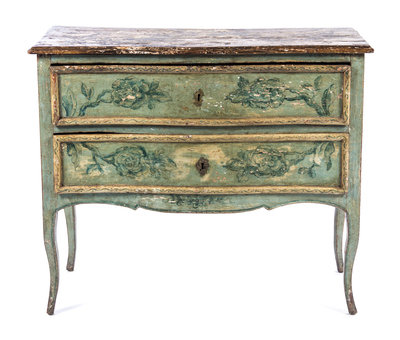 having a rectangular serpentine front top over a conforming case enclosing two drawers, raised on square cabriole legs.