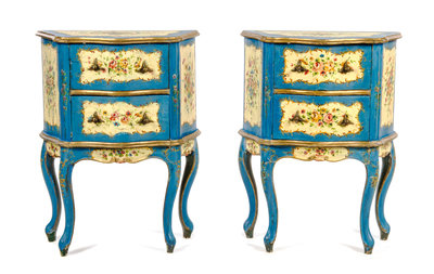 each having a serpentine top over a conforming case enclosing two drawers raised on cabriole legs, the case painted to show floral cartouches on a royal blue ground.