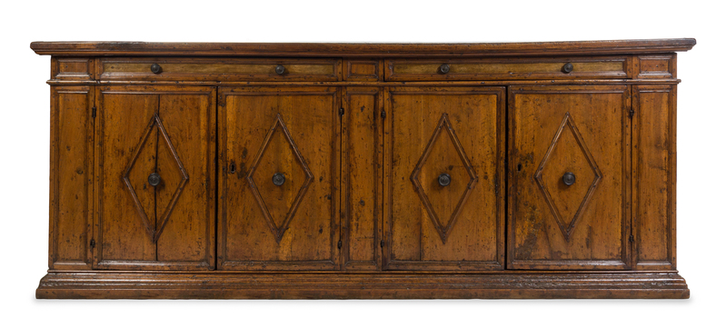 with a rectangular top over a conforming case fitted with two drawers and four doors with diamond decoration, set on a molded plinth base.
