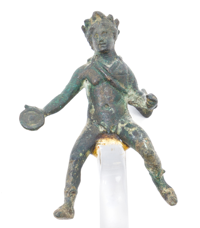 depicting a boy in an astride position, with greenish patina, on a lucite base.