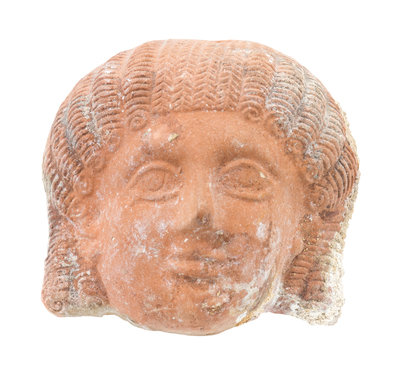with wide almond eyes, a flat nose and hair arranged in rows.