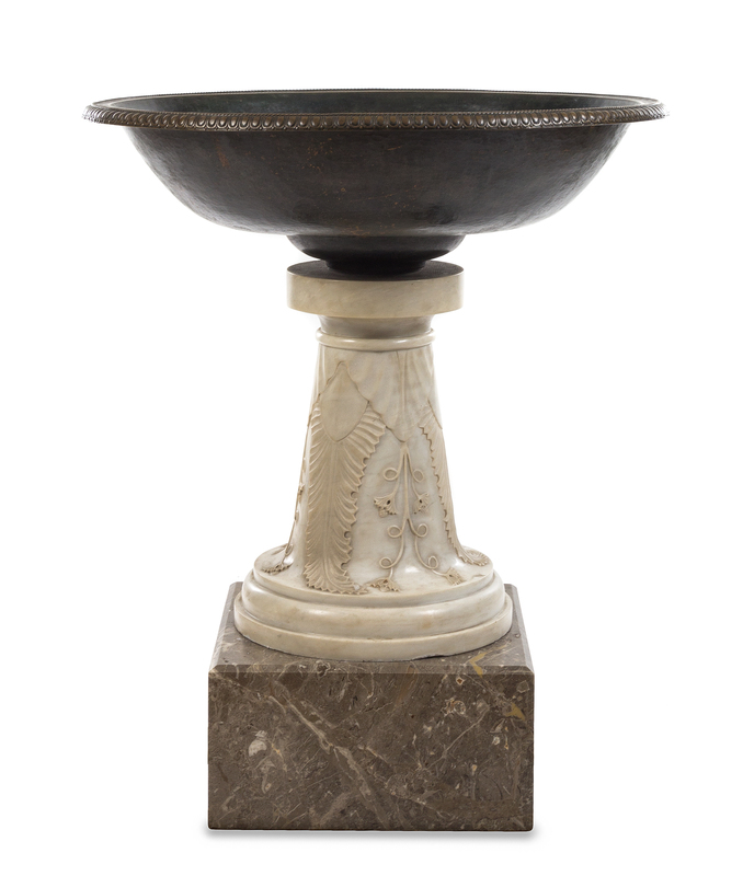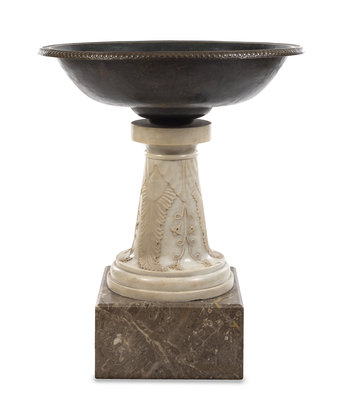 the circular basin raised on a tapering leaf carved support ending in a rectangular base.