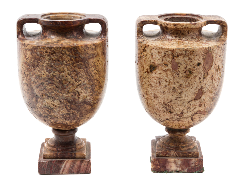 each of ovoid form with twin handles at the shoulders raised on a square foot.
