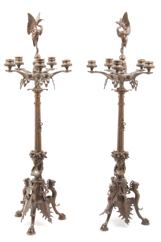 each with stork finial over the reeded standard, raised on tripartite mask and acanthus decorated base ending in monoped feet.