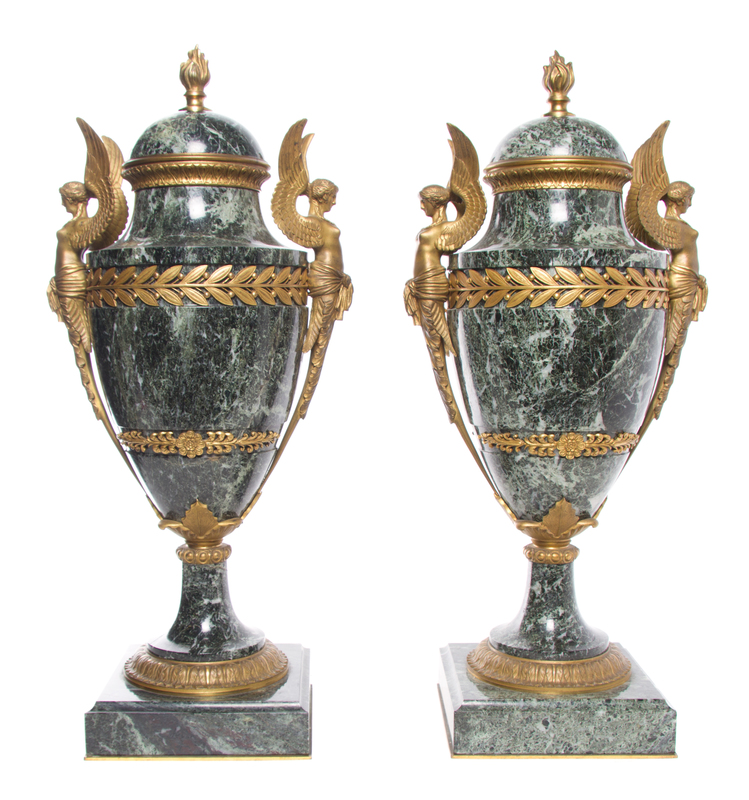 A Pair of Neoclassical Gilt Bronze Mounted Marble Urns