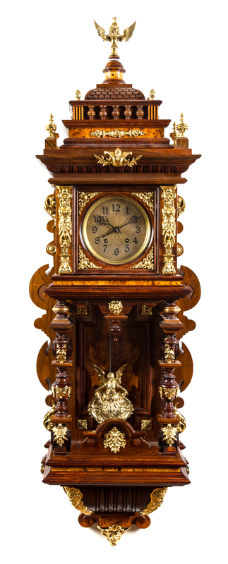 having a circular dial with Arabic numeral hours on a foliate scroll worked face, set in an architectural case surmounted by a bust of a winged Minerva.