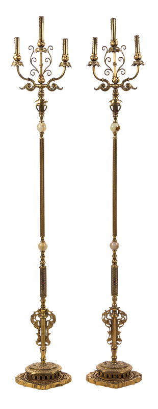 A Pair of Gilt Bronze and Onyx Three-Light Floor Lamps