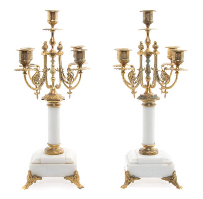 A Pair of Neoclassical Gilt Bronze Mounted Marble Five-Light Candelabra