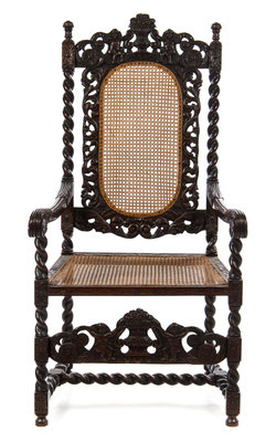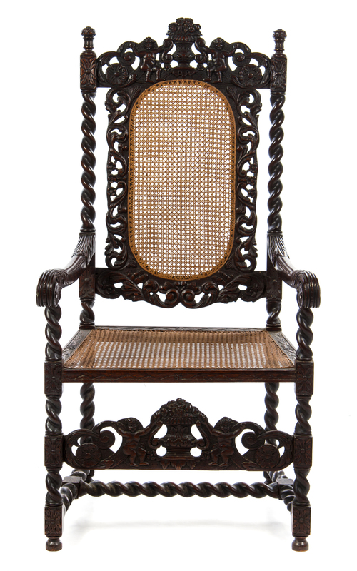 having an oval splat within an openworked foliate scroll frame, above a square seat flanked by scrolling arms raised on spiral twist and floral spray carved legs joined by an H-form stretcher.