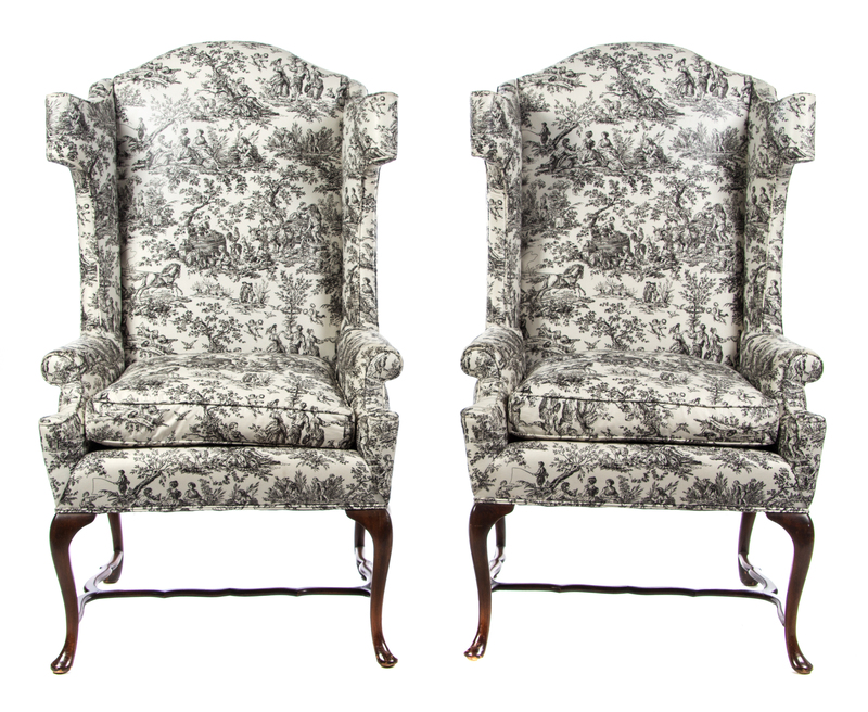 with glazed chintz toile upholstery, raised on cabriole legs joined by stretchers.