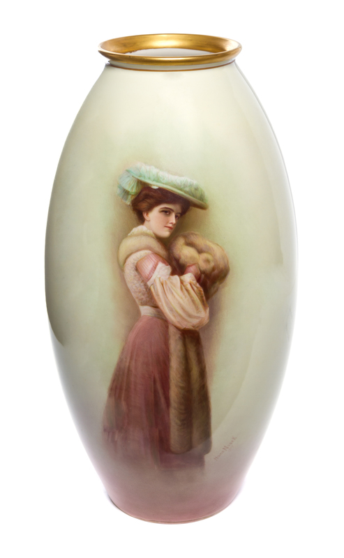 of ovoid form, decorated with a lady in Victorian attire signed Hans Nosek and dated 1907, the base with Belleek Willets mark.