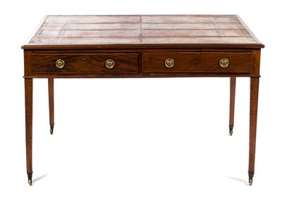 having a rectangular leather-inset top over two drawers, raised on square tapering legs ending in brass caps and casters.
