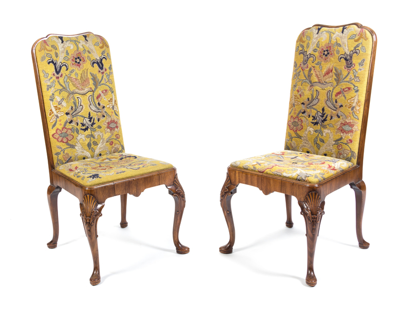 each with a rectangular padded needlepoint upholstered back and drop-in seat, raised on cabriole legs headed by carved shells and ending in pointed pad feet.