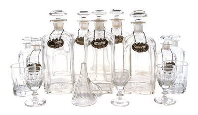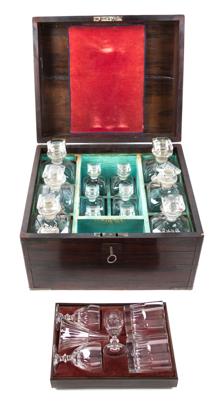 having a rectangular hinged top opening to a fitted interior set with six decanters, six smaller bottles, a funnel, three stems and two tumblers.