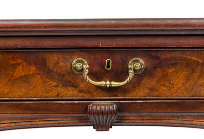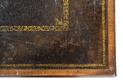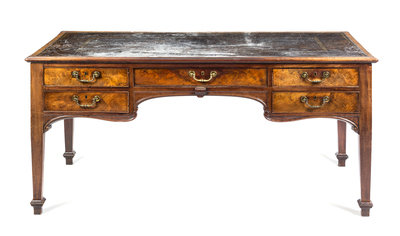 having a rectangular tooled leather and inset top over a long drawer flanked by two banks of two short drawers to each side of the case, raised on square tapering legs ending in brass capped feet.