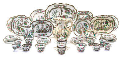 comprising 15 dinner plates, 19 luncheon or salad plates, 7 dessert plates, 25 large teacups, 3 small teacups, a demitasse cup, 7 coffee canns, a variety of saucers, 8 bouillon cups with saucers, 4 soup plates, 4 large egg cups, 8 small egg cups, 2 shakers, 3 creamers, a sauce boat, a trivet, a fruit bowl, 5 vegetable dishes in various sizes, 3 platters in various shapes and sizes, 4 cake plates, 13 small bowls in two sizes, 8 small serving dishes, a teapot, a coffee pot, a water pitcher, 2 covered sugars and 1 open sugar, some articles added later, together with an English ironstone sauce boat; approximately 224 items total.