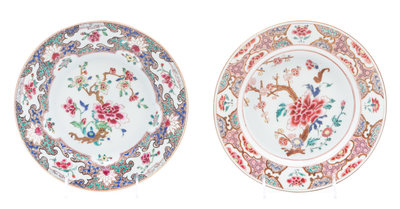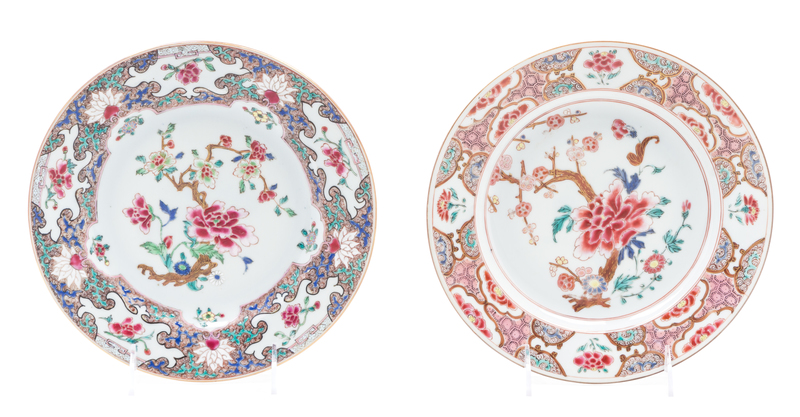 each depicting a flowering sprig within scroll, cartouche and diaper decorated border.