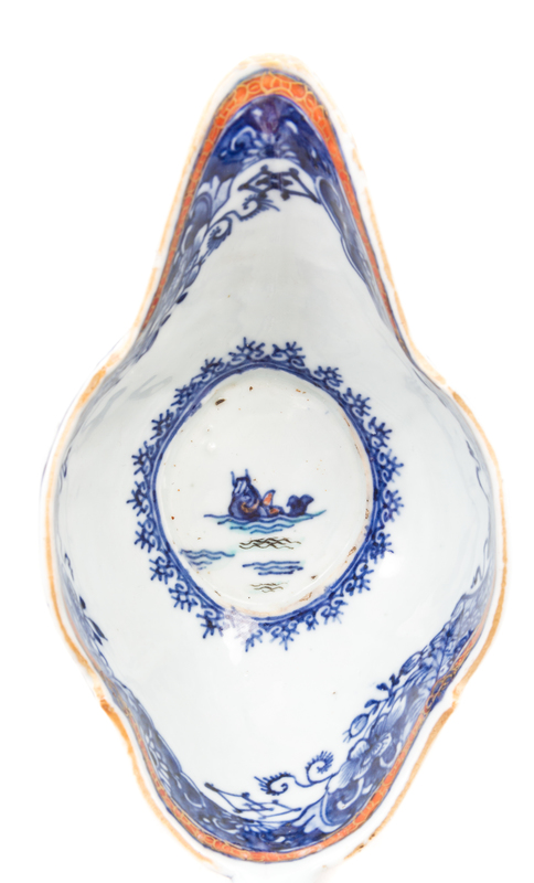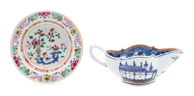 comprising a blue and white sauce boat and a Famille Rose underplate.