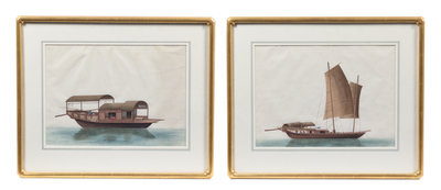 each executed in gouache on paper or pith and depicting a Chinese junk, matted and set in giltwood frames.
