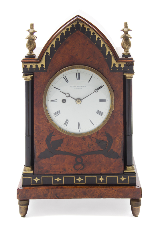 having a circular dial with Roman numeral hours within an arched case, the dial and works signed Henry Thompson London.