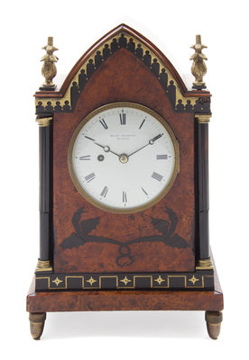 An English Brass and Ebony Inlaid Burlwood Mantel Clock