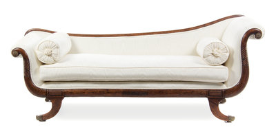 with outscrolled arms, a padded back and a cushion seat, raised on outsplayed legs ending in brass caps and casters.