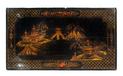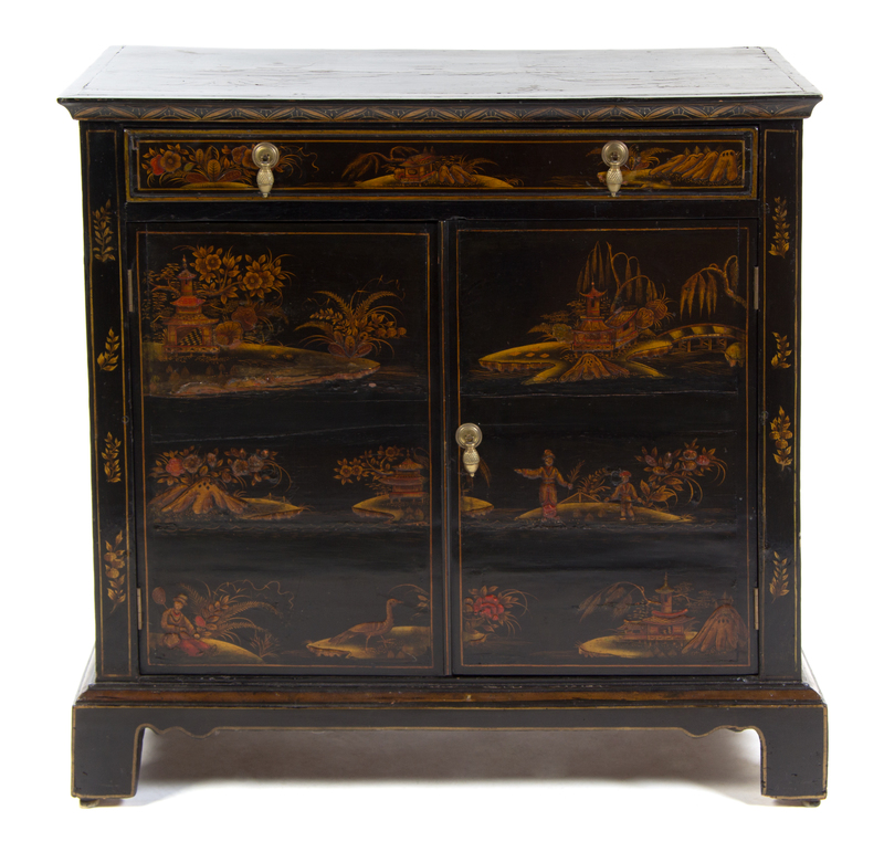 having a rectangular top over a drawer and two doors, raised on bracket feet and decorated with Chinoiserie scenes throughout.