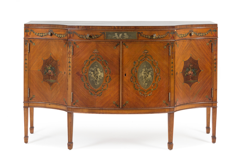 having a shaped top over three frieze drawers and four panel doors, decorated with flowering urns and grisaille reserves depicting Bacchic putti, raised on tapering legs ending in spade feet.