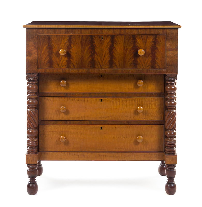 having a rectangular top over a drawer above three graduated drawers flanked by turned columns, raised on turned feet.