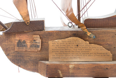 depicting the starboard section of the ship, raised on a wood stand.