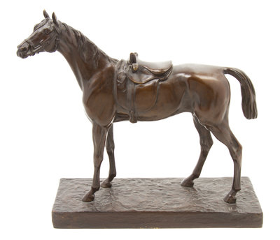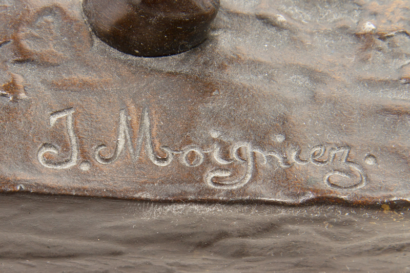 depicting a saddled horse, raised on a naturalistic base, signed J. Moigniez.