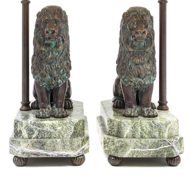 each depicting a seated lion on a rectangular marble base with canted corners, mounted as lamps with silk shades.