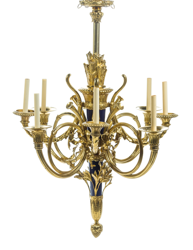 having a cobalt blue center shaft in the form of a quiver of arrows centering hunting horn form candle arms, four of the horns cast with tied ribbons, electrified.