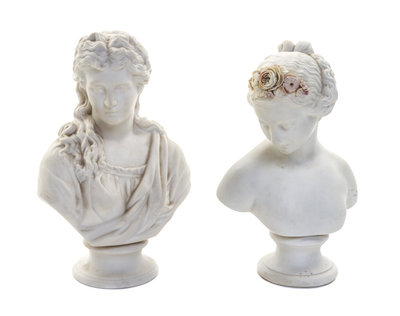 each depicting a maiden, comprising a robed maiden with wavy hair and a topless maiden with a floral corona.