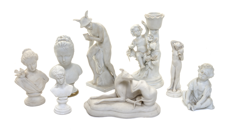 comprising a figure of Mercury, a putto and floral decorated candlestick, a whippet, a nude maiden carrying a jug, a joyful child, and three busts.