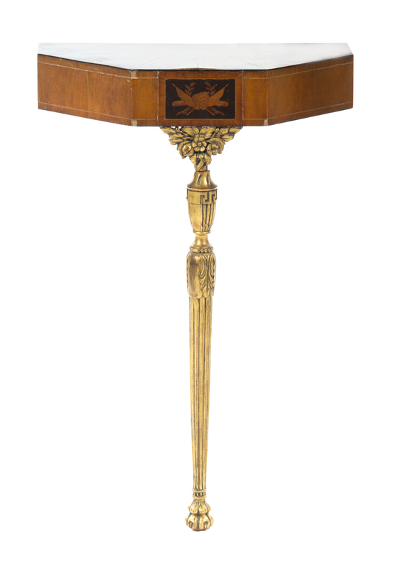 having a half-octagonal top, the frieze inlaid with a musical trophy, raised on a fluted tapering leg ending in a paw foot.