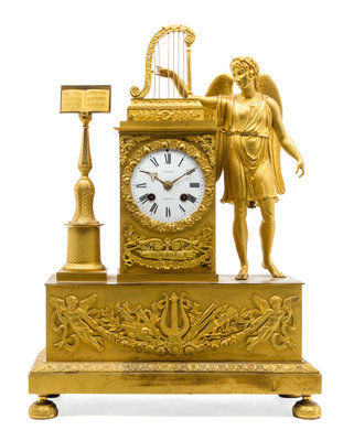 having a circular dial with Roman numerals in a case cast to show a male angel figure and musical instruments.