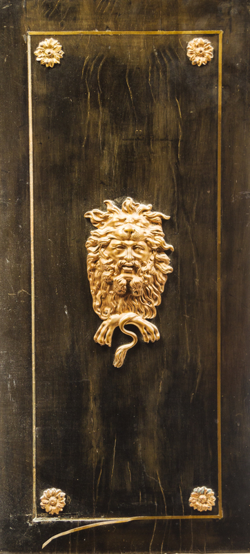 having a later rectangular marble top over two doors decorated with foliate scrolls, the sides mounted with neoclassical masks draped in lion pelts, the whole raised on turned feet.